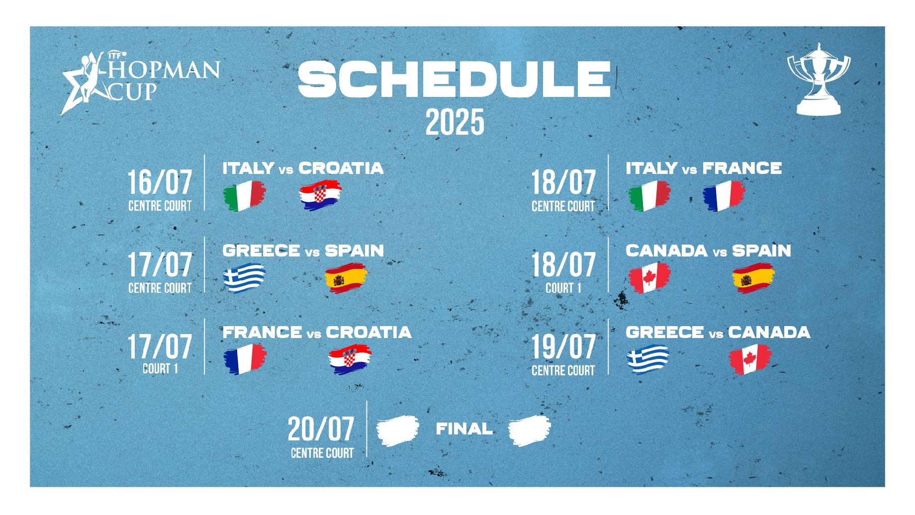 Il torneo comincia mercoledì 16 luglio con il match Italia-Croazia, campione in carica, per proseguire il 17 con Grecia-Spagna e Francia-Croazia. Il 18 sarà la volta di Italia-Francia e Canada-Spagna, il 19 scenderanno in campo i team di Grecia e Canada. Domenica 20 luglio, infine, l’attesa finale per l’aggiudicazione del prestigioso ed ambito trofeo che, nella passata edizione 2023 in Francia (nel 2024 non si è tenuta per la contemporaneità con i Giochi Olimpici), è stato vinto dal team Croazia composto da Donna Vekić e Borna Ćorić.