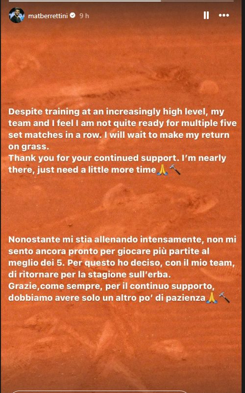 “Nonostante mi stia allenando intensamente, non mi sento ancora pronto per giocare piú partite al meglio dei 5. Per questo ho deciso, con il mio team, di tornare per la stagione sull’erba. Grazie, come sempre, per il continuo supporto, dobbiamo avere solo un altro po’ di pazienza”